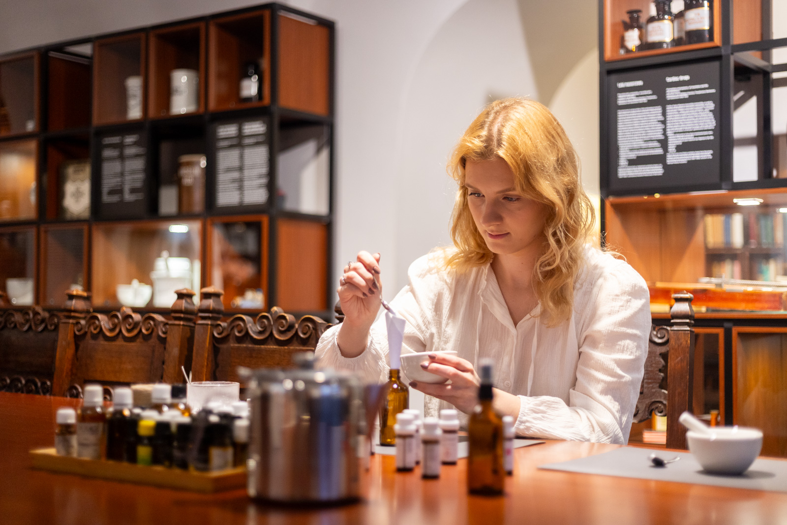 Zapach jest jednym z najważniejszych, choć niewidzialnych „eksponatów” Muzeum Farmacji im. mgr Antoniny Leśniewskiej. To on wypełniał dawne apteki, gdy farmaceuci sporządzali leki z suszonych roślin, korzeni i olejków eterycznych. Podczas warsztatów sięgamy do tej tradycji. Własnymi rękami skomponujecie wodę zapachową na bazie naturalnych olejków, ucząc się przy okazji o leczniczych właściwościach roślin i dawnych recepturach.